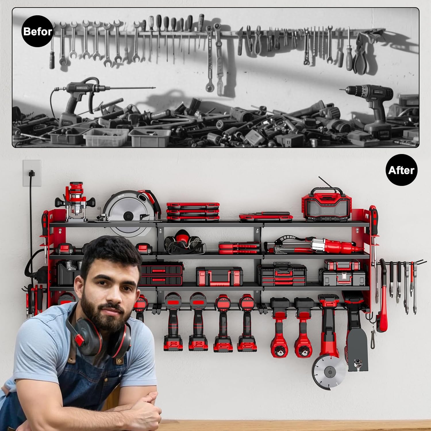 • Customizable Design: The 4-hole power strip can be mounted on either side for convenience, and the adjustable shelves give you full flexibility to organize your tools the way you want