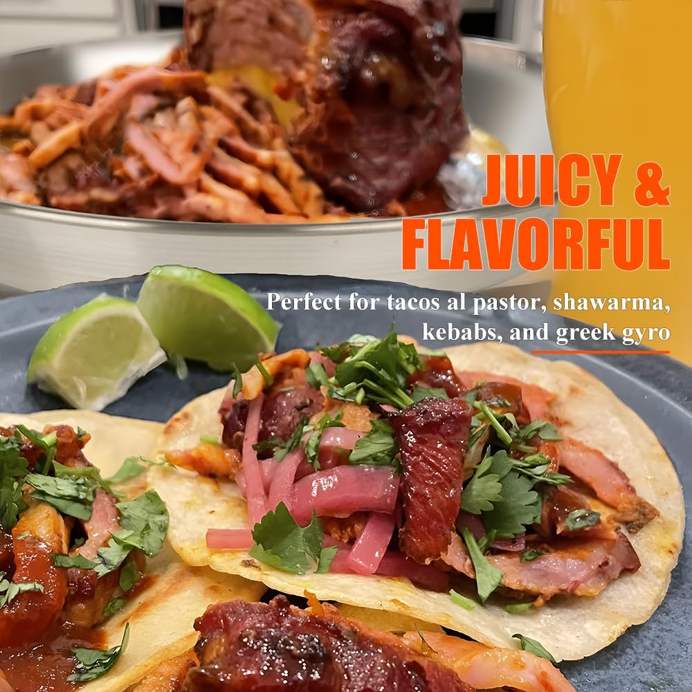 • Perfect for Making Tacos Al Pastor, shawarma, and Gyros at Home: With our vertical skewer, you could just use your oven or your regular Grill to make restaurant-style Gyros, Al Pastor, Shawarma, Doner, Kebabs, Whole Chicken, Fish, even Brazilian Churrascaria dishes right on your own grill or oven. No Rotisserie is needed to make the most flavorful meat you've ever tasted