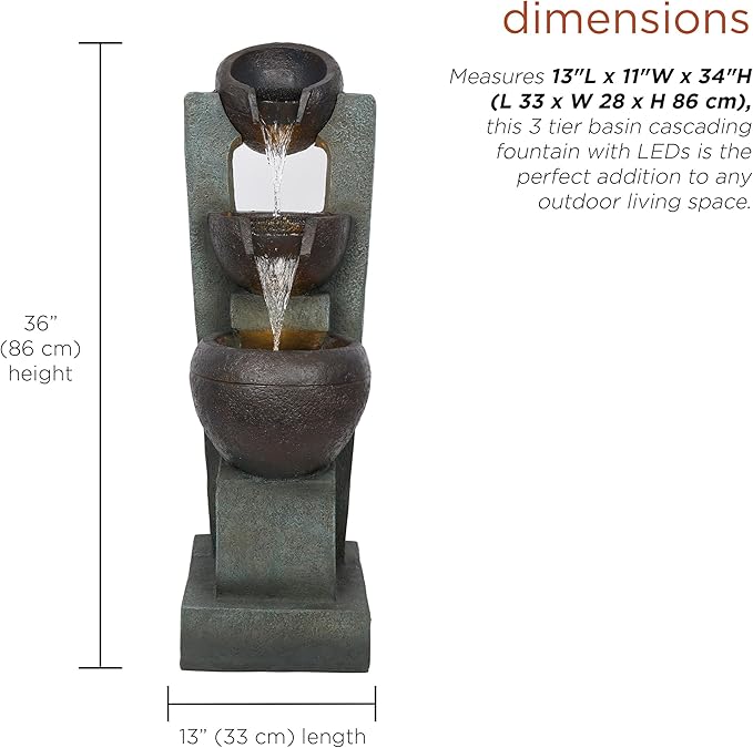 • 34" 3 TIER BASIN CASCADING FOUNTAIN – This elegant 3-tier basin design creates a peaceful cascade of water, flowing gracefully from one level to the next, adding tranquility and charm to your garden, patio, yard, or any outdoor space for an inviting atmosphere.