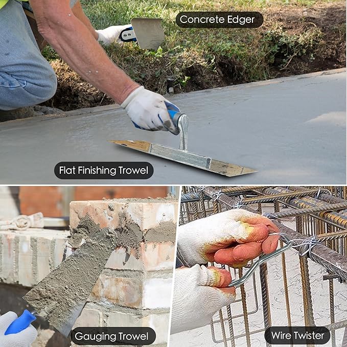 • 【10-Piece Contractor-Grade Concrete & Masonry Tool Kit】Includes wood float, flat finishing trowel, pool trowel, gauging trowel, margin trowel, edger, groover, wire twister, anti-slip gloves, and a heavy-duty carry bag. From rough surface prep to detailed edgework and rebar tying, this concrete trowel set meets the demands of both contractors and serious DIYers