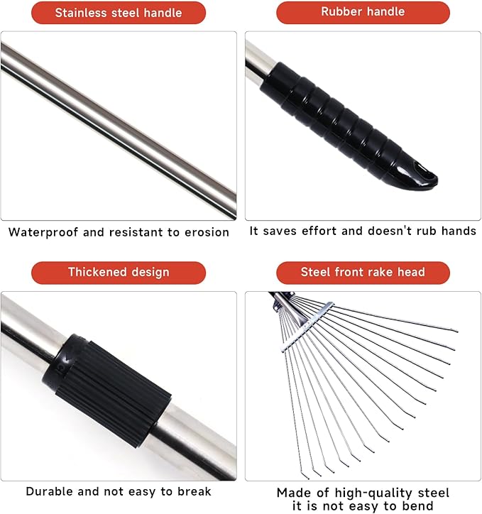 • High-Quality Structure The high-quality stainless steel handle and hardened steel are water-resistant and not prone to rust. They are more durable than ordinary metal rakes in bad weather.