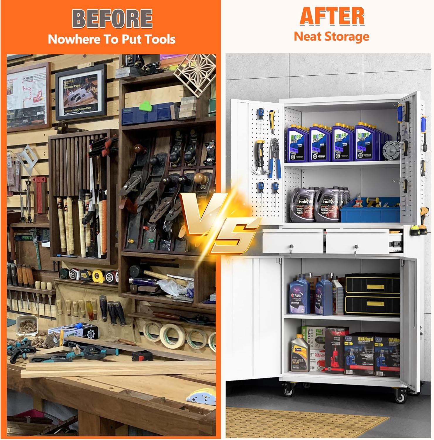 • 【Upgraded Design & More Space】 Storage cabinet offers plenty of space to meet your storage needs. There are nail boards behind and on both sides of the cabinet door. In addition to being perfect for storing large quantities of items, the metal storage cabinets outside hanging hole design adds extra space to any room