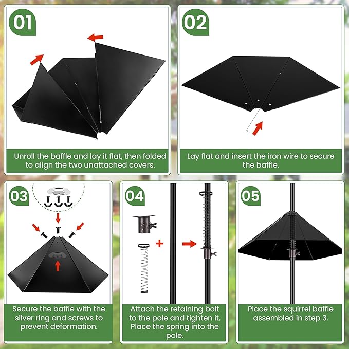 • Squirrel Proof: The newly designed metal squirrel baffle is 19 inches in diameter and is wider and larger. With the addition of the spring, the elasticity of the squirrel baffle is increased, effectively preventing squirrels and raccoons.