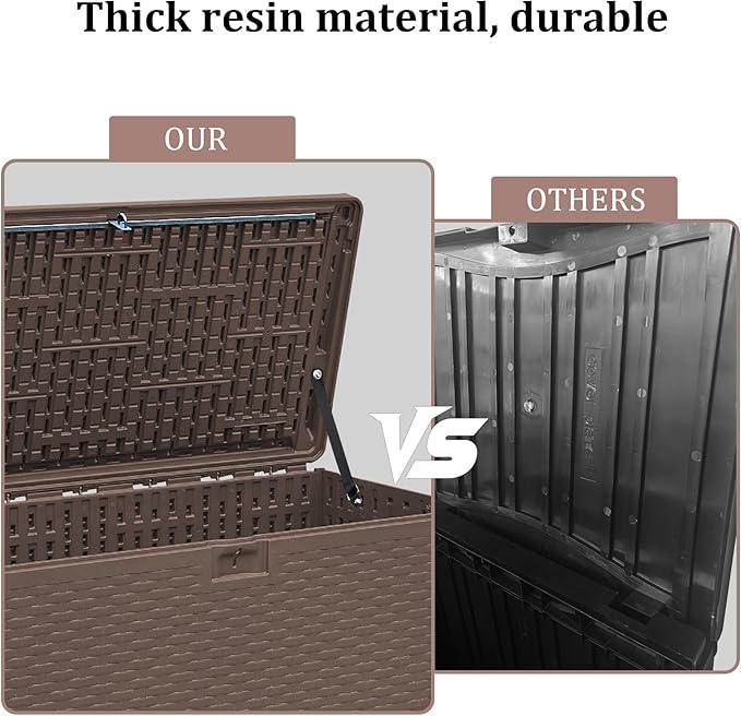 • All-Weather Durability Built to withstand any weather, our deck box is made from resin that offers waterproof, UV-resistant, and corrosion-resistant protection. No matter the season—be it scorching sun or heavy rain—this box will keep your items dry and its exterior looking as good as new.