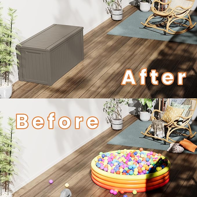 • Built to withstand any weather, our deck box is made from resin that offers waterproof, corrosion-resistant protection, and UV-resistant. No matter the season—be it scorching sun or heavy rain—this box will keep your items dry .