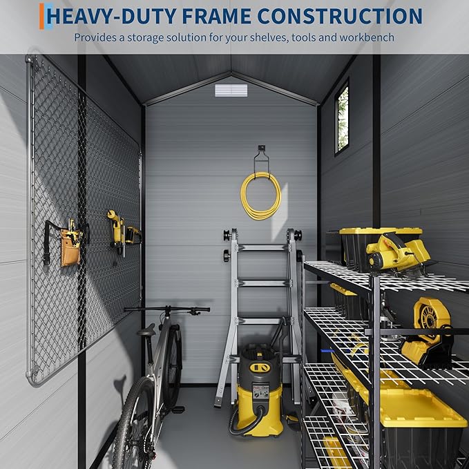 - RESIN MATERIAL - Our outdoor shed resin is crafted from 12MM premium polypropylene resin plastic, which is recyclable and eco-friendly. This resin shed offers exceptional durability, being corrosion-resistant, waterproof, rustproof, and providing over 8,000 hours of UV protection. These features ensure worry-free use in all weather conditions. The double wall panels further enhance its performance, effectively preventing water and moisture ingress