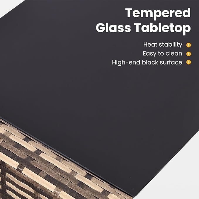 • Ergonomic Comfort:High-density foam cushions with breathable polyester covers provide lumbar support. The PE wicker is waterproof. The large, long glass top table provides plenty of space for snacks and drinks and is easy to clean. If you feel too tired to wipe the table top, you can rinse it directly with water, which is very convenient