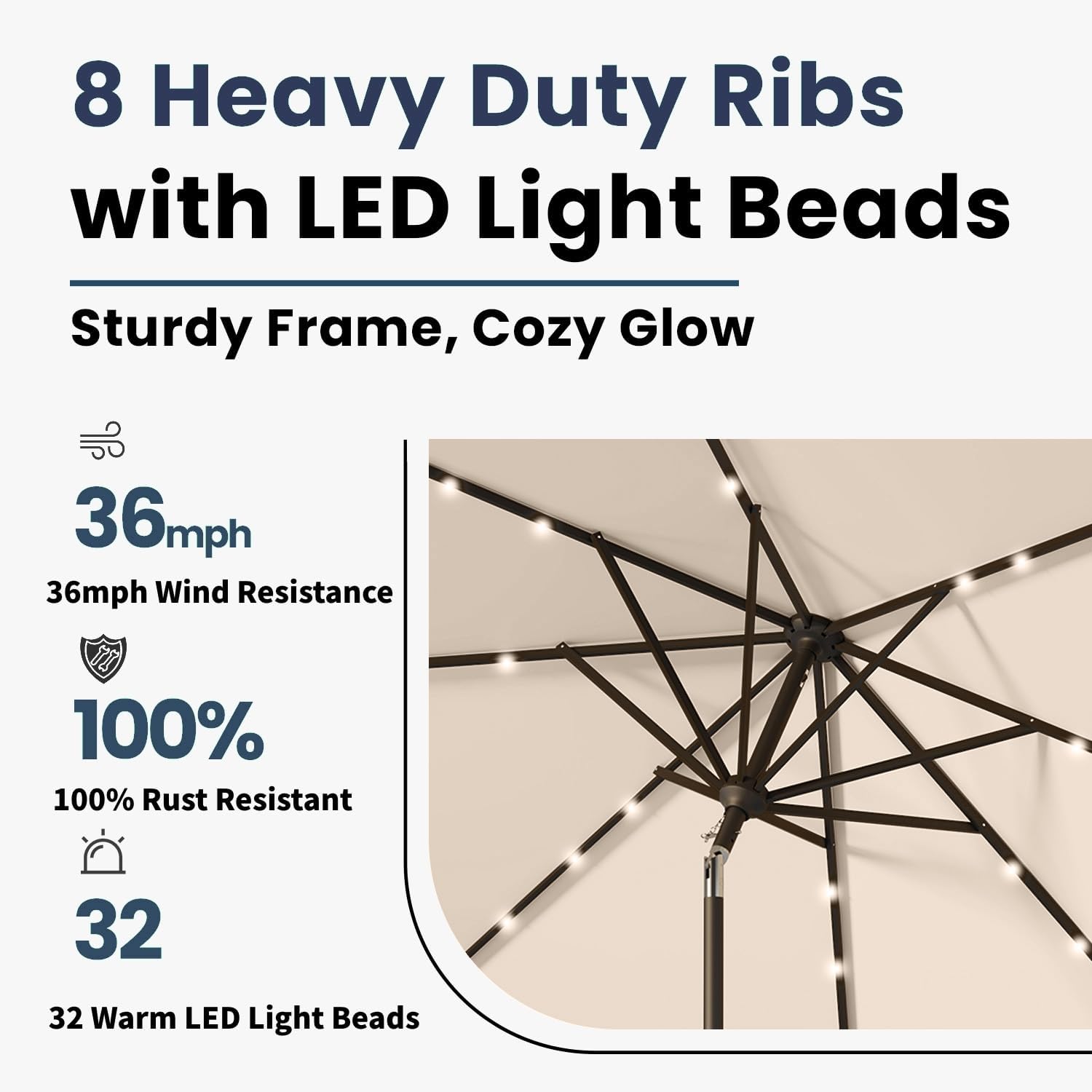 • 32 Solar-Powered LED Lights: Illuminate your evenings with 32 built-in LED lights powered by a high-efficiency solar panel, without the need for external power sources, providing up to 8 hours of ambient lighting.