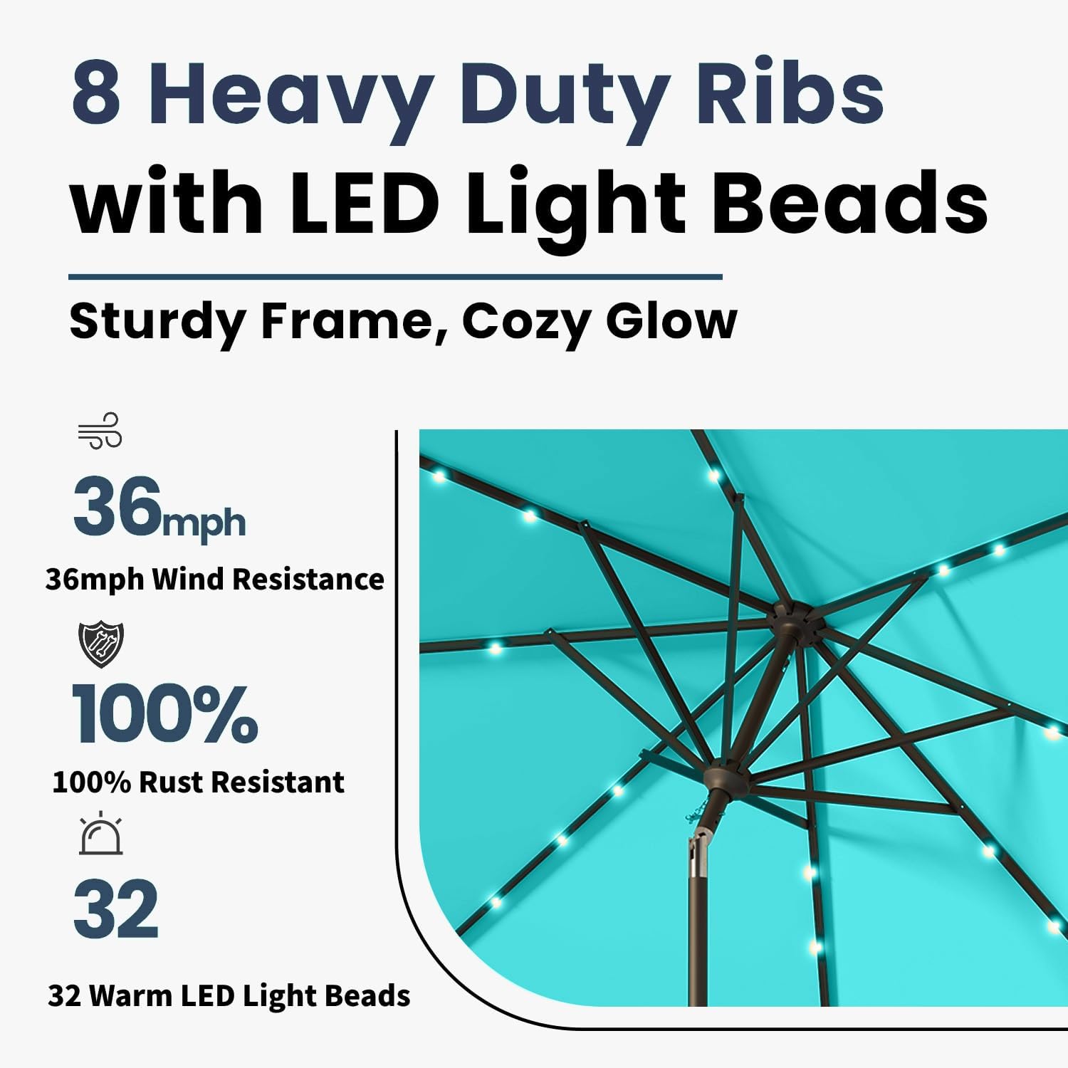 10FT Solar Umbrella 32 LED Lighted Patio Umbrella Table Market Umbrella w/Tilt and Crank, UV-Resistant Outdoor Umbrella for Pool, Garden, Deck, Aqua Blue