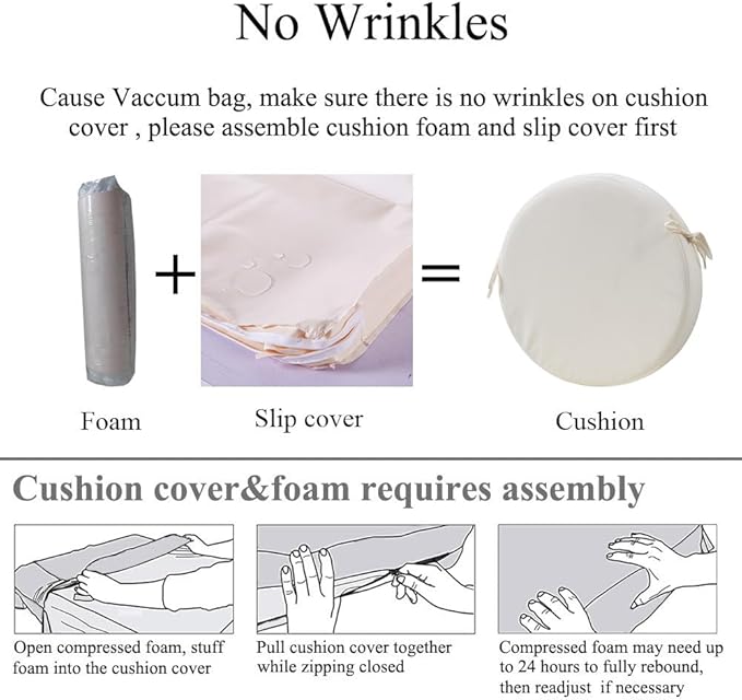 • 【Comfort & Support】 Experience ultimate comfort with the high density foam of these patio chair cushions set of 2. They provide excellent support for your hip, promoting good posture and allowing you to relax for extended periods of time. All outdoor dining chair cushions are packed with vacuum bag. You need to assemble cushion to make there is no wrinkles in cushion covers