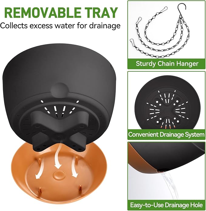 • 【Watering Made Easy】 Our hanging plant pots feature a built-in drainage system and a water reservoir tray that stores enough water for 7-14 days, preventing root rot and ensuring proper hydration. Ideal for busy schedules or travel, offering hassle-free plant care.