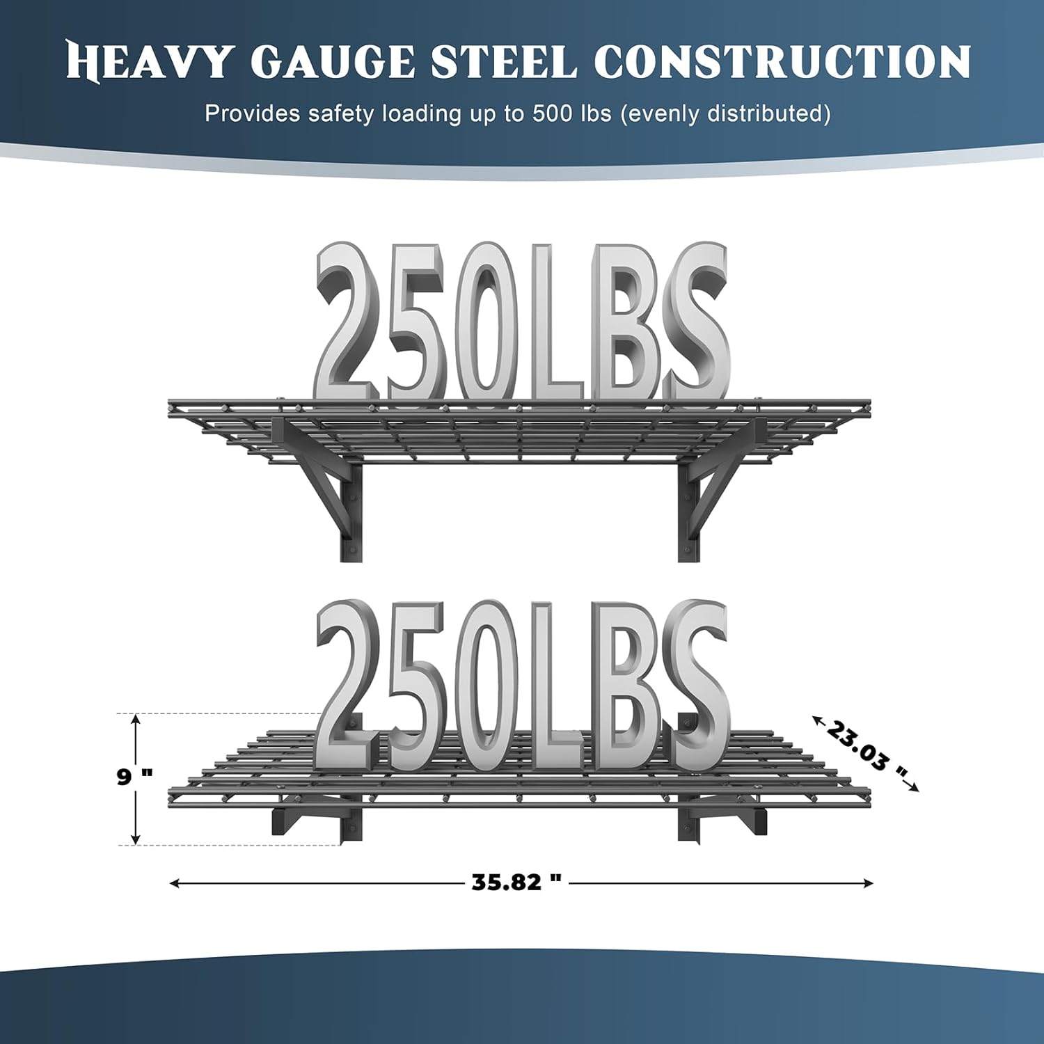 • 🏆【Heavy-Duty Load Capacity】- Jusgym garage shelving wall mounted system is engineered with premium steel, offering exceptional strength. Each 2x3ft bracket holds up to 250 lbs, and with 2 shelves totaling 500lbs capacity, it effortlessly stores bulky items like tools, tires, and heavy storage bins. Built to last, even under extreme weight!