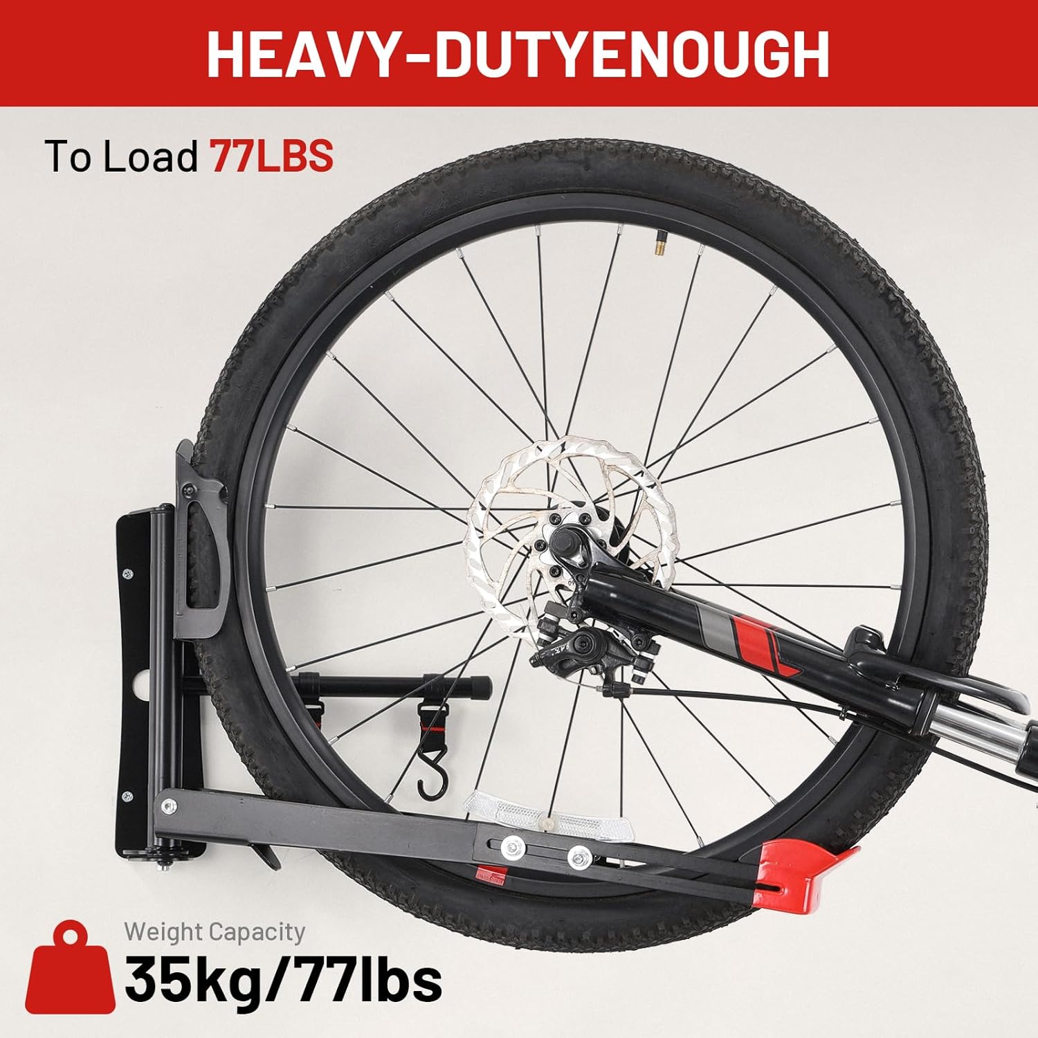 • 【Durable & Secure Construction】Bike wall hanger made of sturdy carbon steel material, our wall bike rack can support up to 77 lbs. The rubber-coated front wheel holder prevents wheel scratches, and the rear tire tray enhances bike stability and prevents wall scratches.