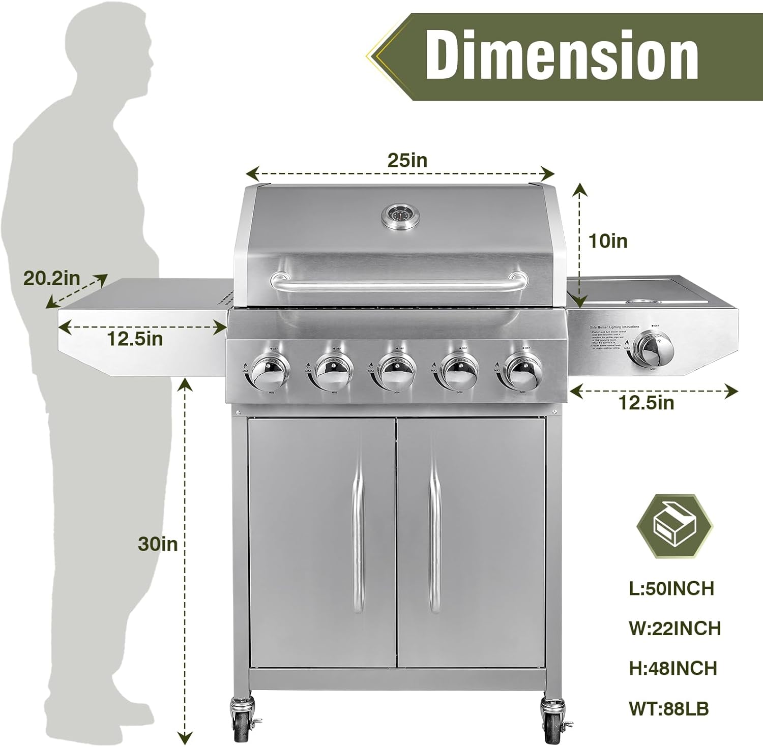 • 🔥 【All-Weather Performance】 Rain or shine, enjoy year-round grilling. Weather-resistant design withstands high heat and humidity. Bonus storage cabinet holds propane tanks, tools, and accessories.