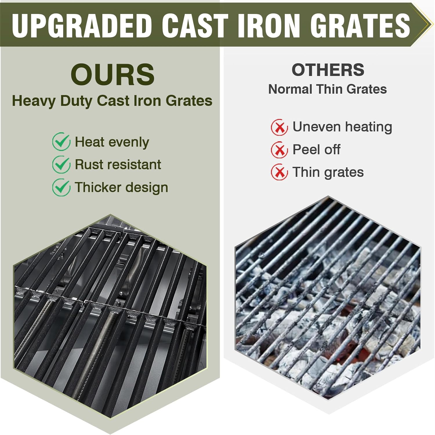 • 🔥 【Commercial-Grade Cooking Space】 Massive 647 sq in porcelain-enameled grates + 252.5 sq in warming rack. Fits 40+ burgers or 8 racks of ribs. Heavy-duty cast iron grates retain heat evenly for perfect sear marks.