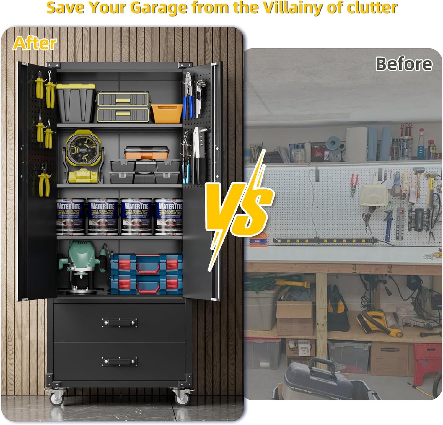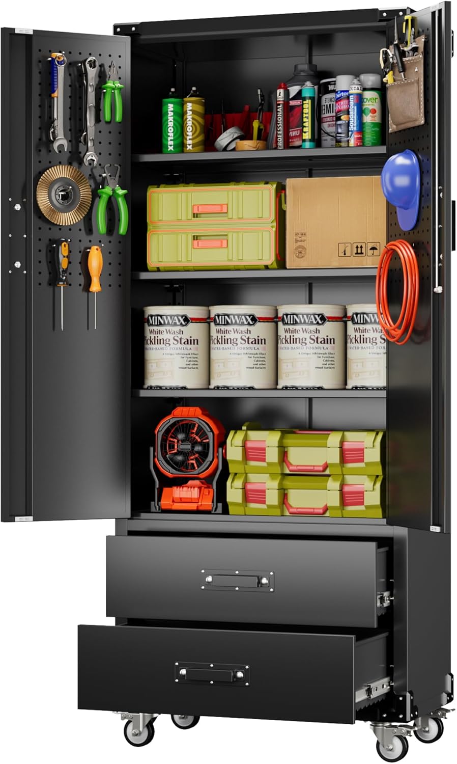• 【Adjustable Shelves & 2 Large Space Drawer】 Garage storage cabinet has a total of 3 shelves which can be adjusted and also guaranteeing maximum adaptability and convenience for your own unique storage and organizing needs. Each shelf holds up to 120 lbs, which is perfect for storing household items, supplies, tools, documents, etc.This cabinet also have a ball-bearing full-suspension drawer that open and close quietly and easily.