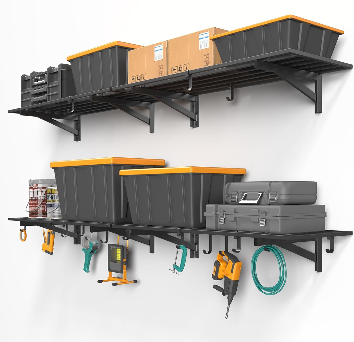 • HEAVY-DUTY GARAGE SHELVING: Our 4-Pack wall-mounted shelves provide generous storage, featuring two 1.5'x4' shelves per unit. Built from heavy-duty steel, each shelf holds up to 200 lbs, offering a combined capacity of 800 lbs. Ideal for garages, warehouses, offices, and beyond, these shelves are designed for durability, stability, and efficient space organization