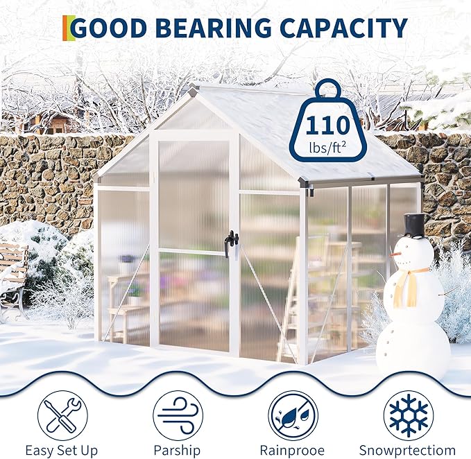 • 【Resilient Construction】Designed to endure challenging weather, our greenhouse features 720g/m² polycarbonate panels and a solid aluminum steel frame. This design ensures stability and protection during heavy rain and gale. Keep your plants safe and thriving in a reliable greenhouse built to last.