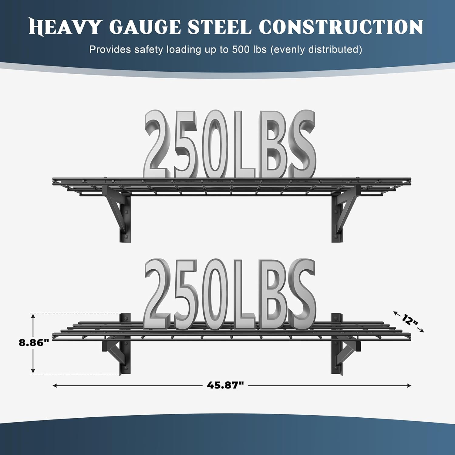• 🏆【Heavy-Duty Load Capacity】- Jusgym garage shelving wall mounted system is engineered with premium steel, offering exceptional strength. Each 1x4ft bracket holds up to 250 lbs, and with 2 shelves totaling 500lbs capacity, it effortlessly stores bulky items like tools, tires, and heavy storage bins. Built to last, even under extreme weight!