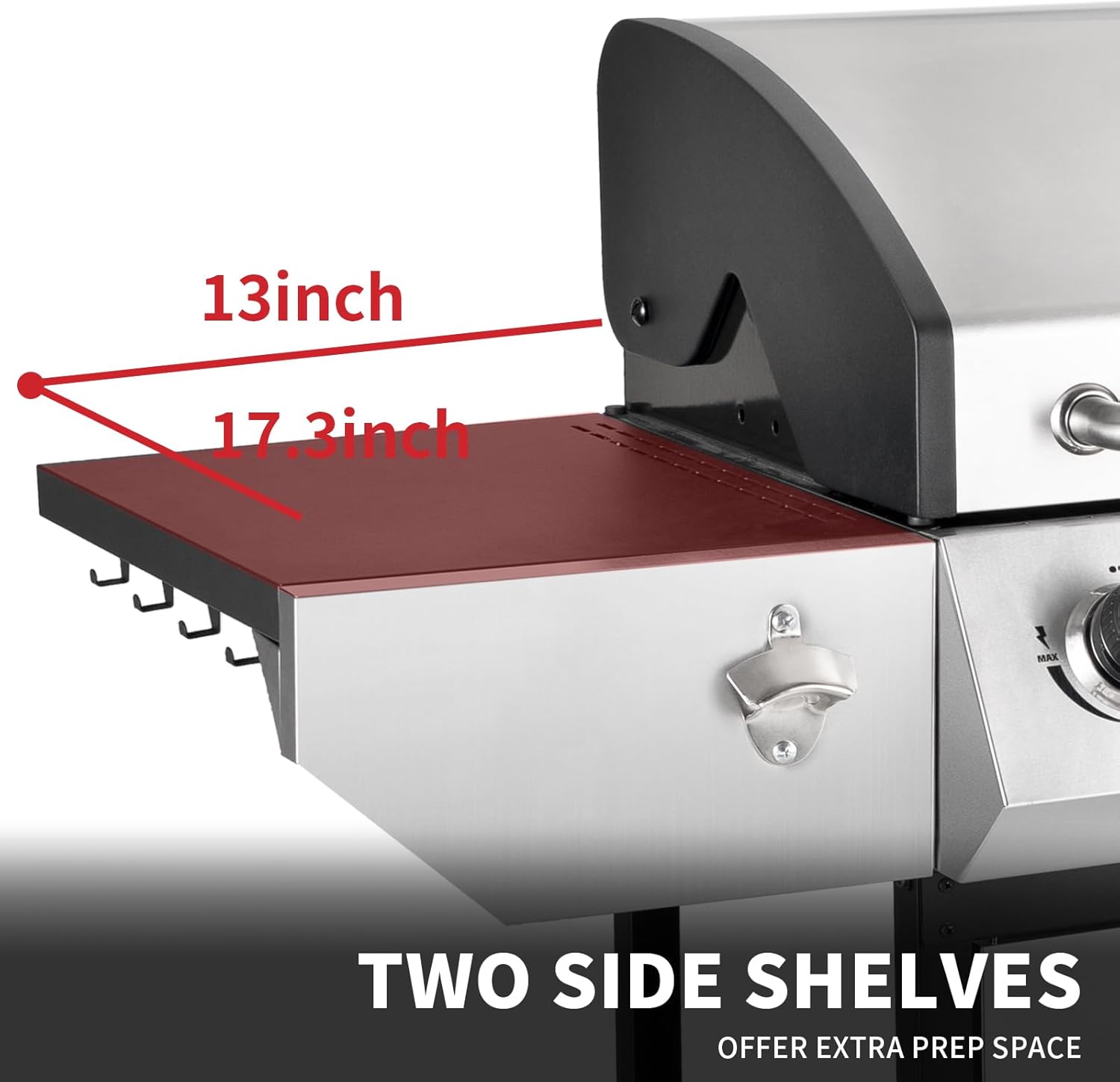 • 【53000BTU COOKING POWER】 Barbecue Gas Grill’s burner head is made of 304 stainless steel. 4 main burners and side burner Gas grills provide a total 53,000 BTU of cooking power including 44,000BTU main cooking space and 9,000 BUT side burner.