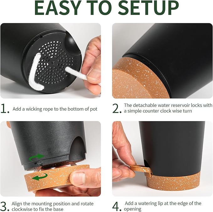• Self-Watering Planter System:These 4 inch small self watering plant pots feature a built-in wick rope that draws water from the reservoir, ensuring consistent hydration for your indoor and outdoor plants. Perfect for busy plant owners and those who forget to water!