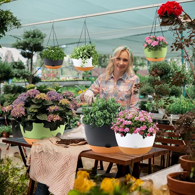 • 【Self-Watering Hanging Flower Pots with Removable Saucer】The innovative recessed design under each hanging indoor planter maintains optimal water levels for your plants and serves as a reservoir for consistent watering. This feature eliminates the hassle of watering plants while you're away on business trips or traveling, thanks to our hanging plant pot.