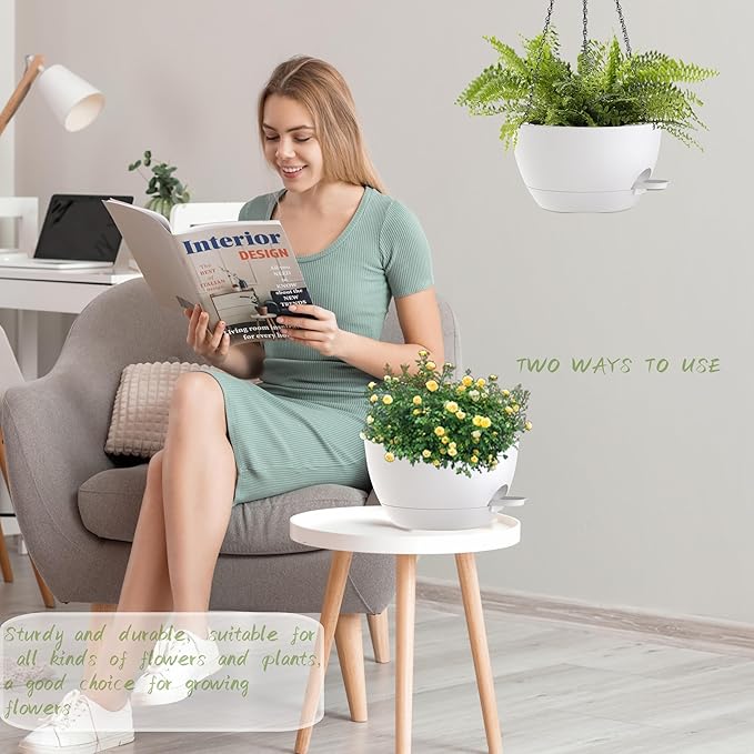 • 【Self-Watering Hanging Flower Pots with Removable Saucer】the appearance and structural design of the Hanging Pot prevents overwatering and acts as a water reservoir to promote Plant growth. It is suitable for a variety of Hanging Pot Plants, such as ivy, Herbs, Ferns, Philodendrons, Succulents, Flowers or other Plants