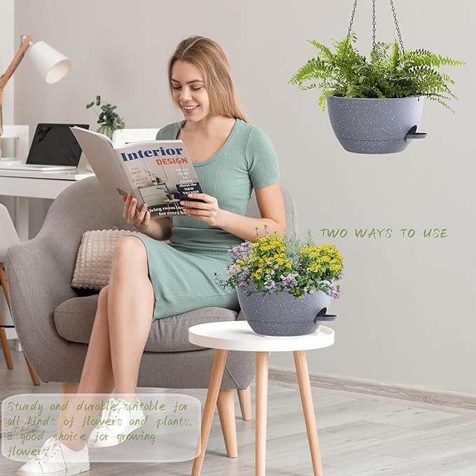 • 【Self-Watering Hanging Flower Pots with Removable Saucer】the appearance and structural design of the Hanging Pot prevents overwatering and acts as a water reservoir to promote Plant growth. It is suitable for a variety of Hanging Pot Plants, such as ivy, Herbs, Ferns, Philodendrons, Succulents, Flowers or other Plants
