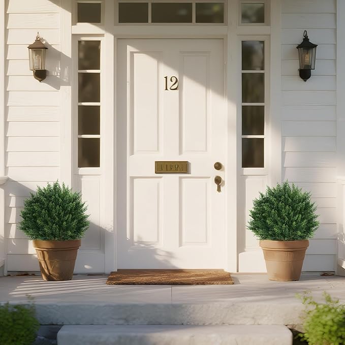 Artificial Set of 2 Cedar Topiary Ball Trees 16" for Outdoors with Ground Spike, UV Resistant Faux Cypress Plants, Evergreen Shrubs Bushes for Front Porch Garden Backyard Decor