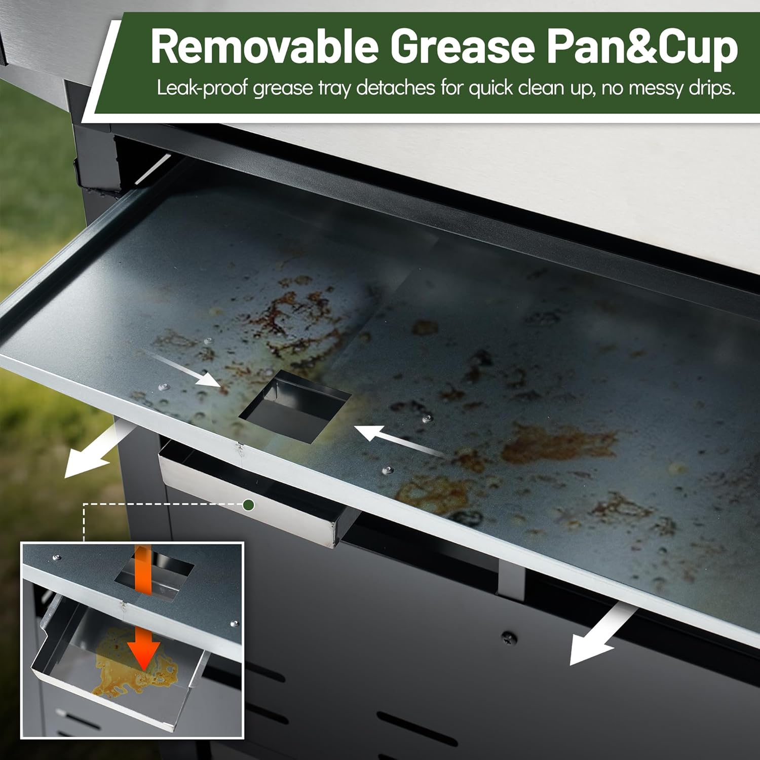 • THOUGHTFUL FEATURE DESIGN: This heavy-duty camping grill is meticulously designed, with a hook on the right side to securely hang a 20-pound propane tank and a stainless steel towel rack on the left for convenient cleaning. The new galvanized pull-out grease tray and grease collection pan combine practicality and convenience, making every grilling session enjoyable. Four swivel casters with brakes ensure smooth and easy movement
