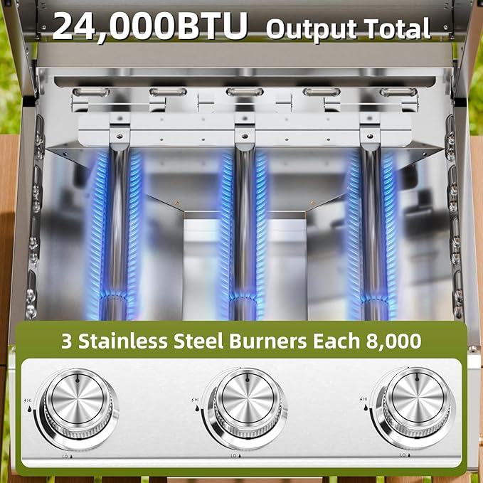 • 3*8,000 BTU BURNERS: Featuring three powerful stainless-steel burners, each with 8,000 BTUs of heat. With twist start ignition and independent control knobs, you can freely control the heat to let your food in a good mood.