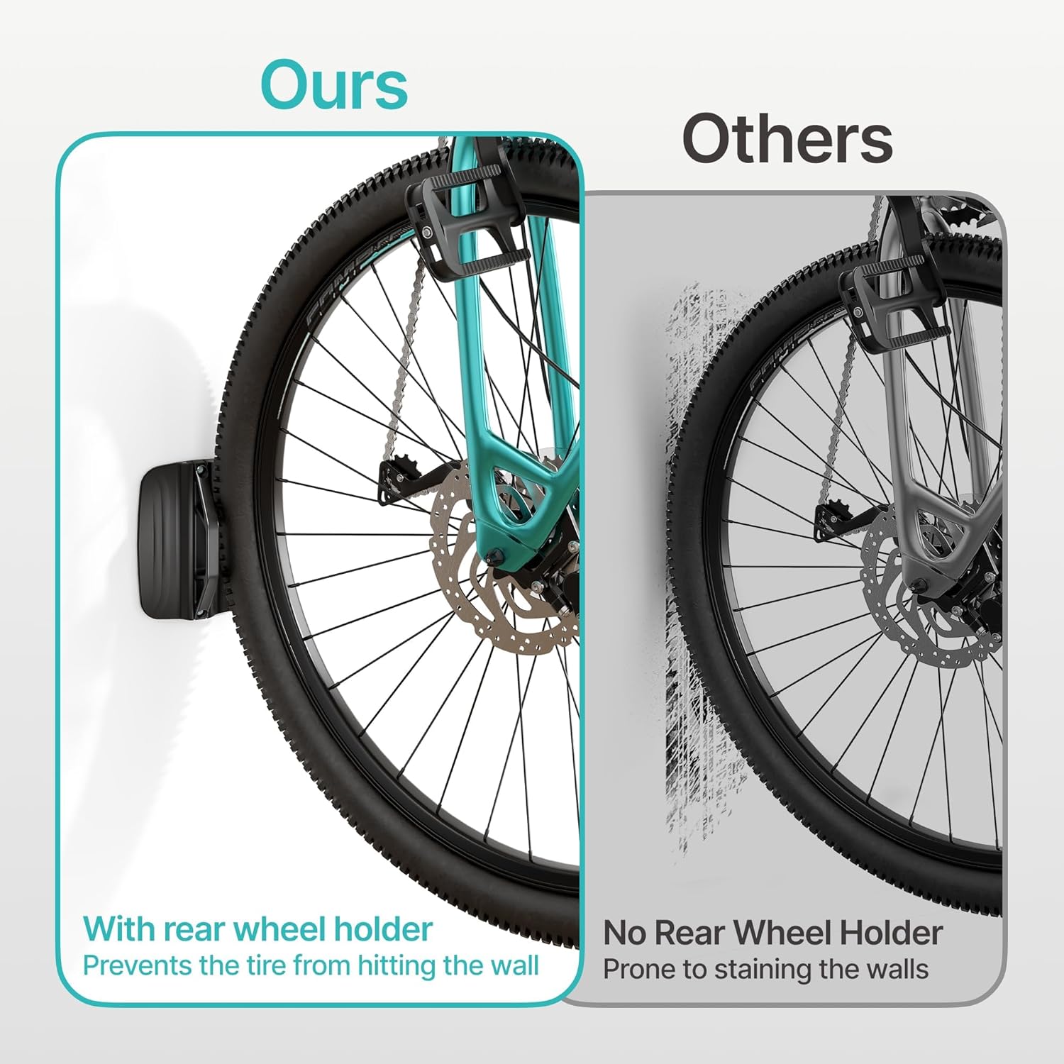 • 【Flexible Storage】Whether in a studio or garage, this bike wall hanger allows you to adjust your bike’s angle up to 65° at any time. This flexibility helps you maneuver around obstacles and park your bike in the most convenient position, eliminating space limitations and preventing cluttered hallways. Additionally, the bike hanger’s rear wheel stabilizer protects your walls from tire marks and dirt.