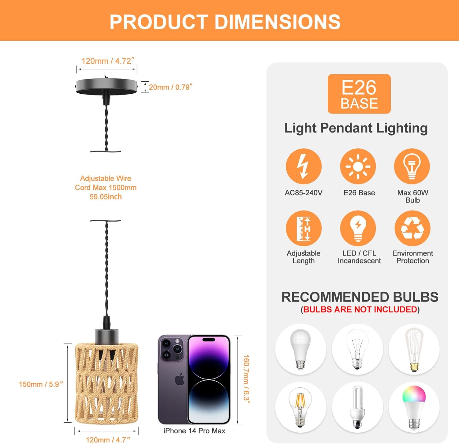 • 🔧 【Quick & Easy Installation】The woven rattan pendant light comes with all mounting hardware and clear instructions.Its hardwired design ensures long-lasting durability,and you can install it in minutes—no electrician needed!