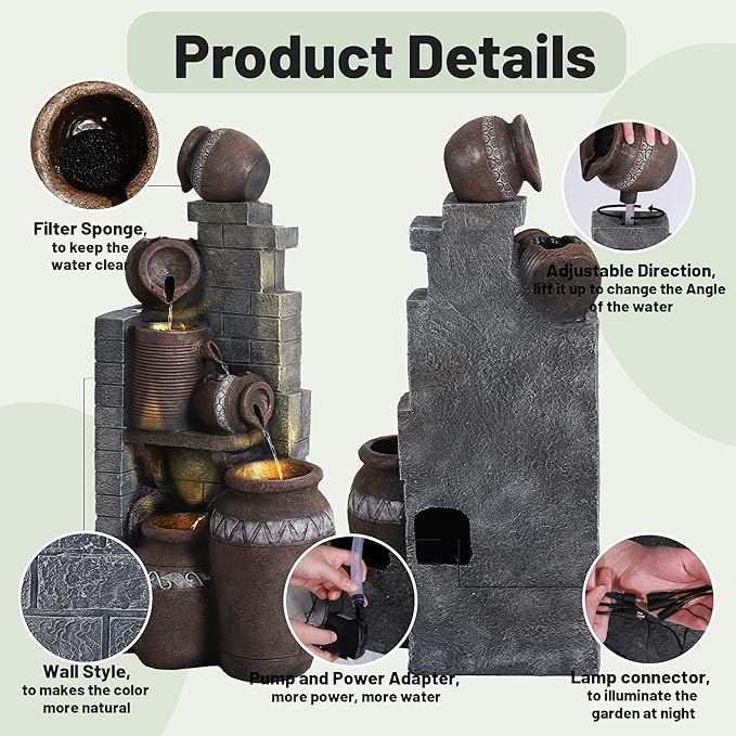 • Relaxing Water Flowing: The 6-Tires garden fountains cascading outdoor provides a sense of fluidity and movement, a soothing stream of water flowing down from each tier, mimicking the sound of a real waterfall, and adding a serene ambience