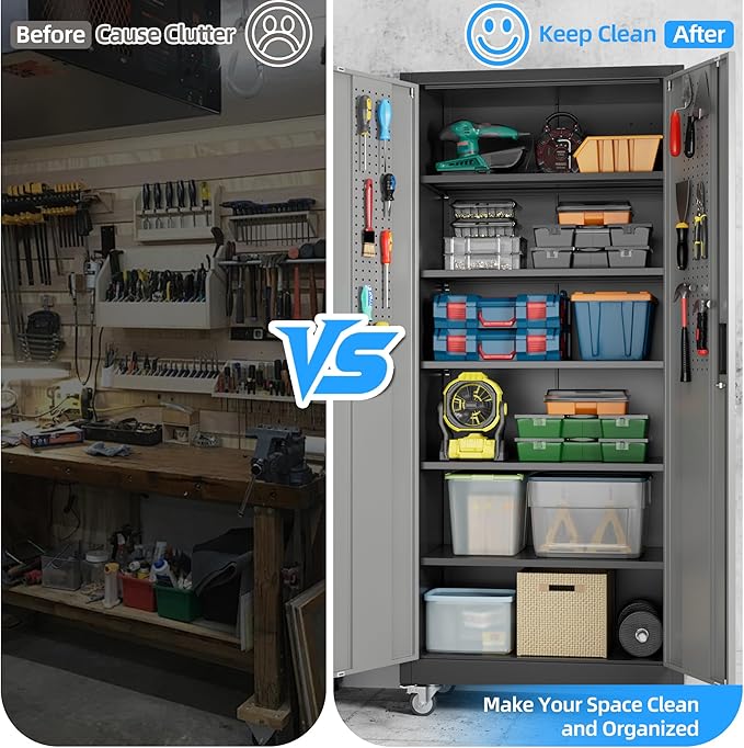 • Ample & Flexible Storage Solutions: Maximize organization with 5 adjustable shelves (customizable height) and pegboard on both doors, paired with 4 hooks for hanging tools, accessories, or gear. This design of the garage storage cabinet with wheels adapts to your needs, whether storing heavy-duty items or small essentials;