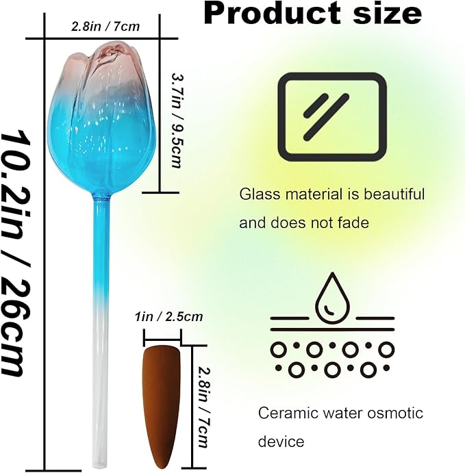 • Decorative & Functional Planter Insert: Tulip-shaped bulbs double as chic decor while hydrating plants. Translucent glass sparkles in sunlight, enhancing indoor windowsills or outdoor patio displays
