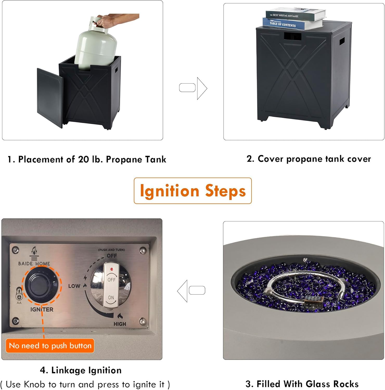 • Boasting a robust 50,000 BTU heat output, this outdoor fire pit table provides powerful and effective warmth. It features electronic ignition and a flame control knob that allows you to adjust the flame size from low to high. Utilize a standard 20 lb propane gas tank (Tank not included).