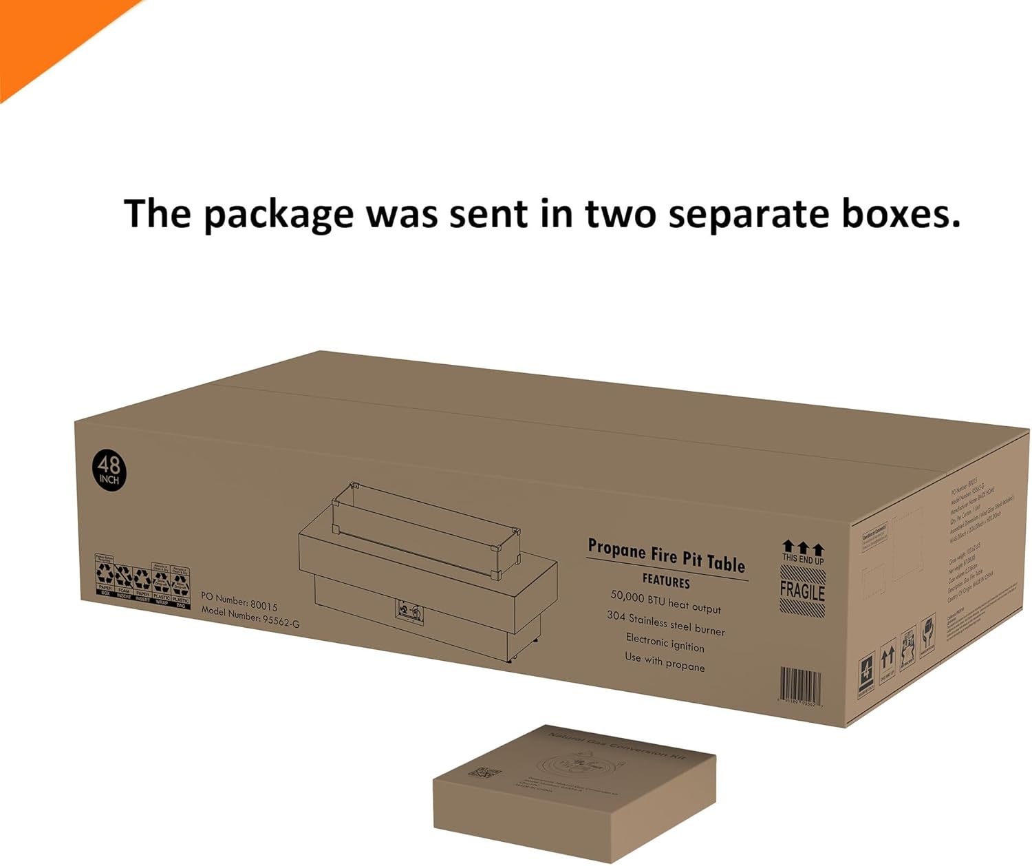 • Natural Gas Conversion Kit - Includes a natural gas conversion kit to convert the propane version to natural gas version, which will be shipped separately. We shipped the package in two separate boxes, It is possible that one package will arrive before the other.
