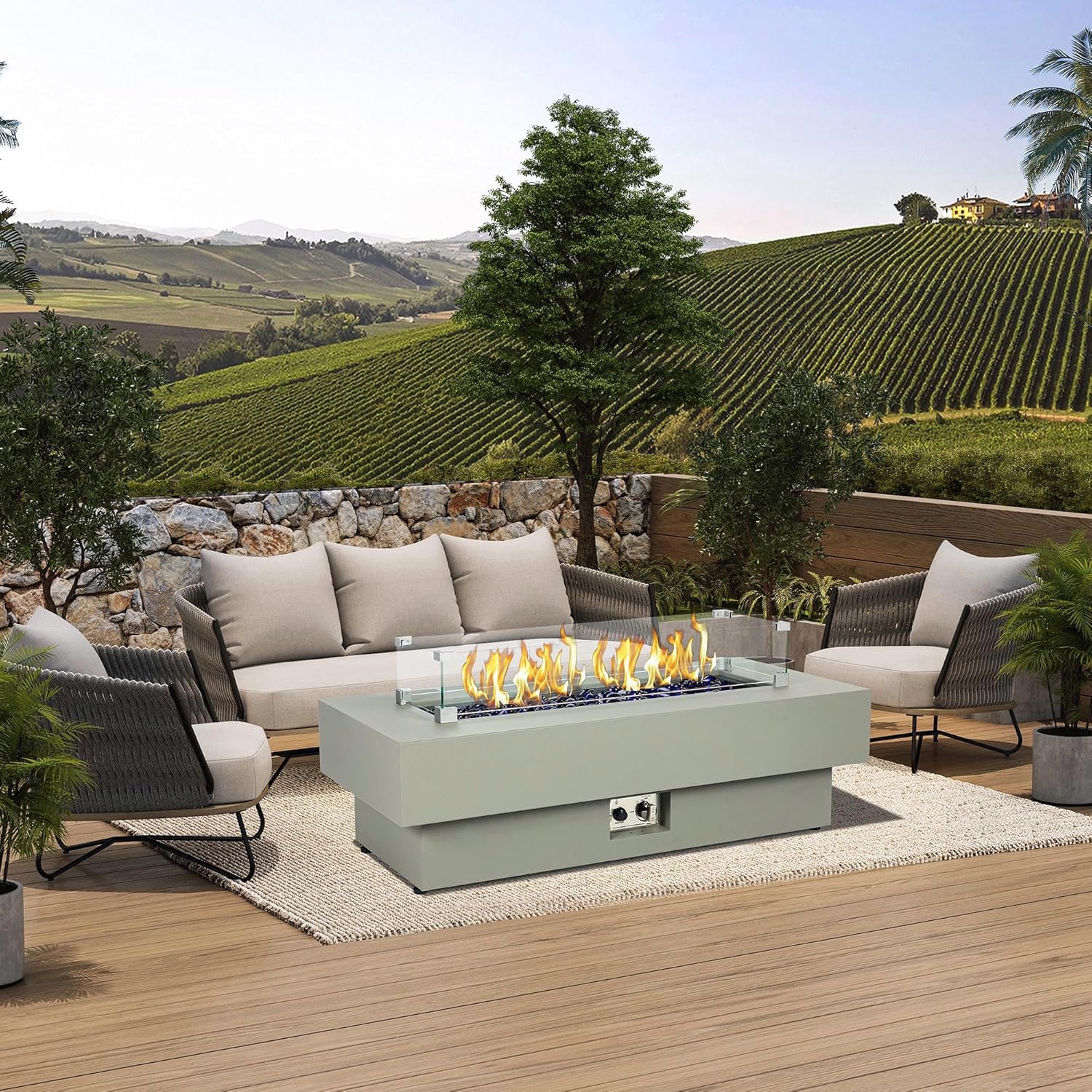 • Wind Glass Shield Included - The round gas fire pit includes a wind glass shield to protect the flame, keeping it steady on windy days.