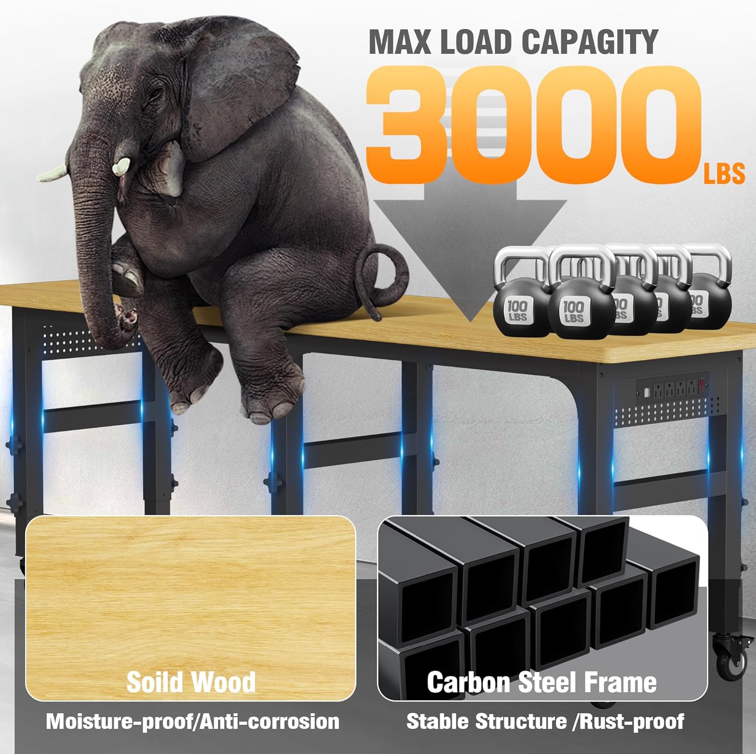 • Heavy-Duty and Durable Construction: The table top of this heavy duty workbench is made of solid wood and finely polished to prevent cracking, the legs and additional support rods are made of reinforced carbon steel with a weight capacity of over 3000 lbs