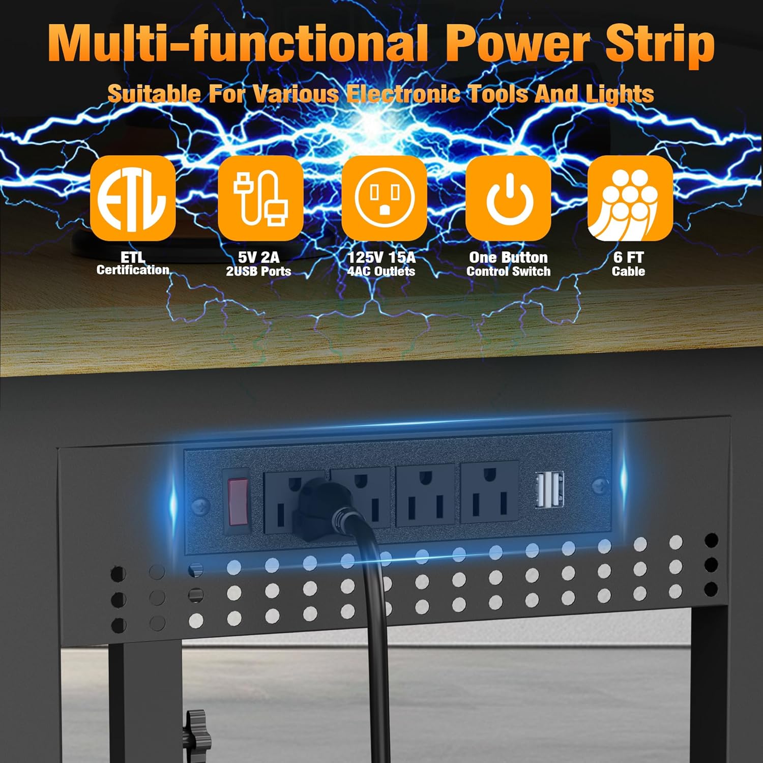 • Built-in Power Outlet & Pegboard: The power strip has 4 AC outlets, 2 USB ports and 1 switch to ensure safety and durability; the built-in pegboard on both sides allows you to organize your tools and accessories efficiently and keep the space tidy