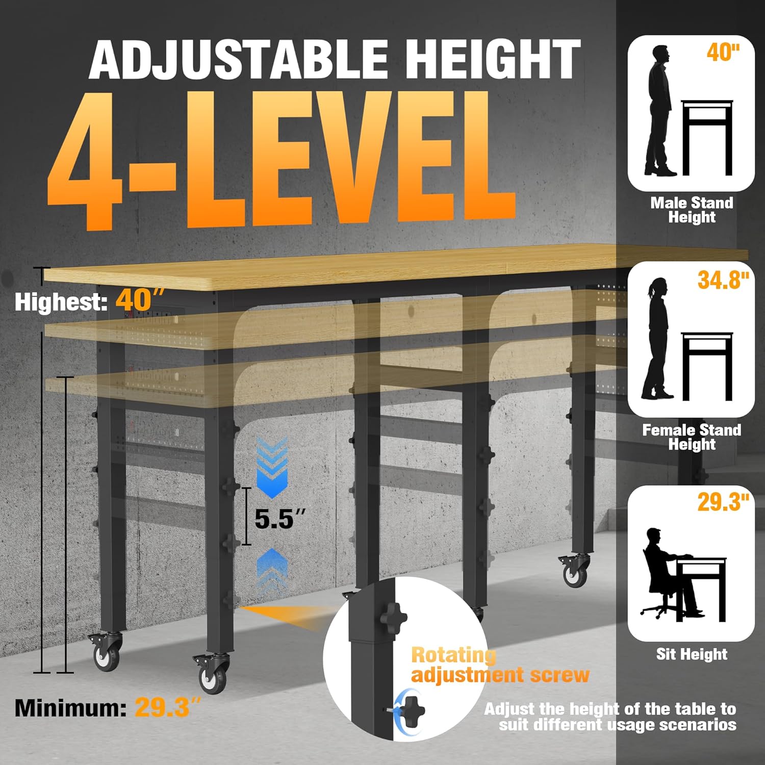 • Multi-Level Height Adjustable: Without additional tools, the workbench can be adjusted to 4 different heights from 29.3" to 40", allowing you to work more comfortably standing or sitting, preventing you from staying in the same position for a long time