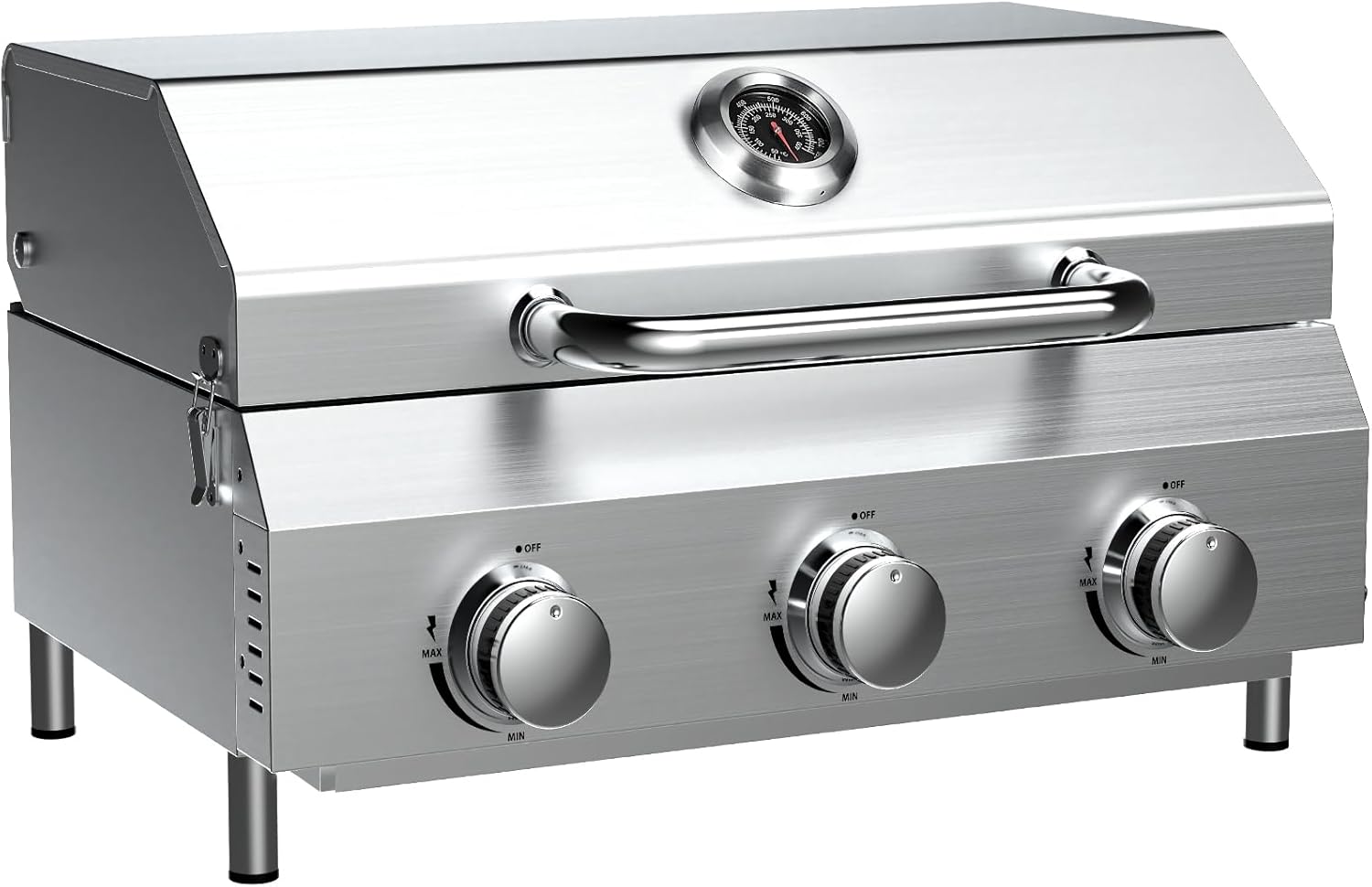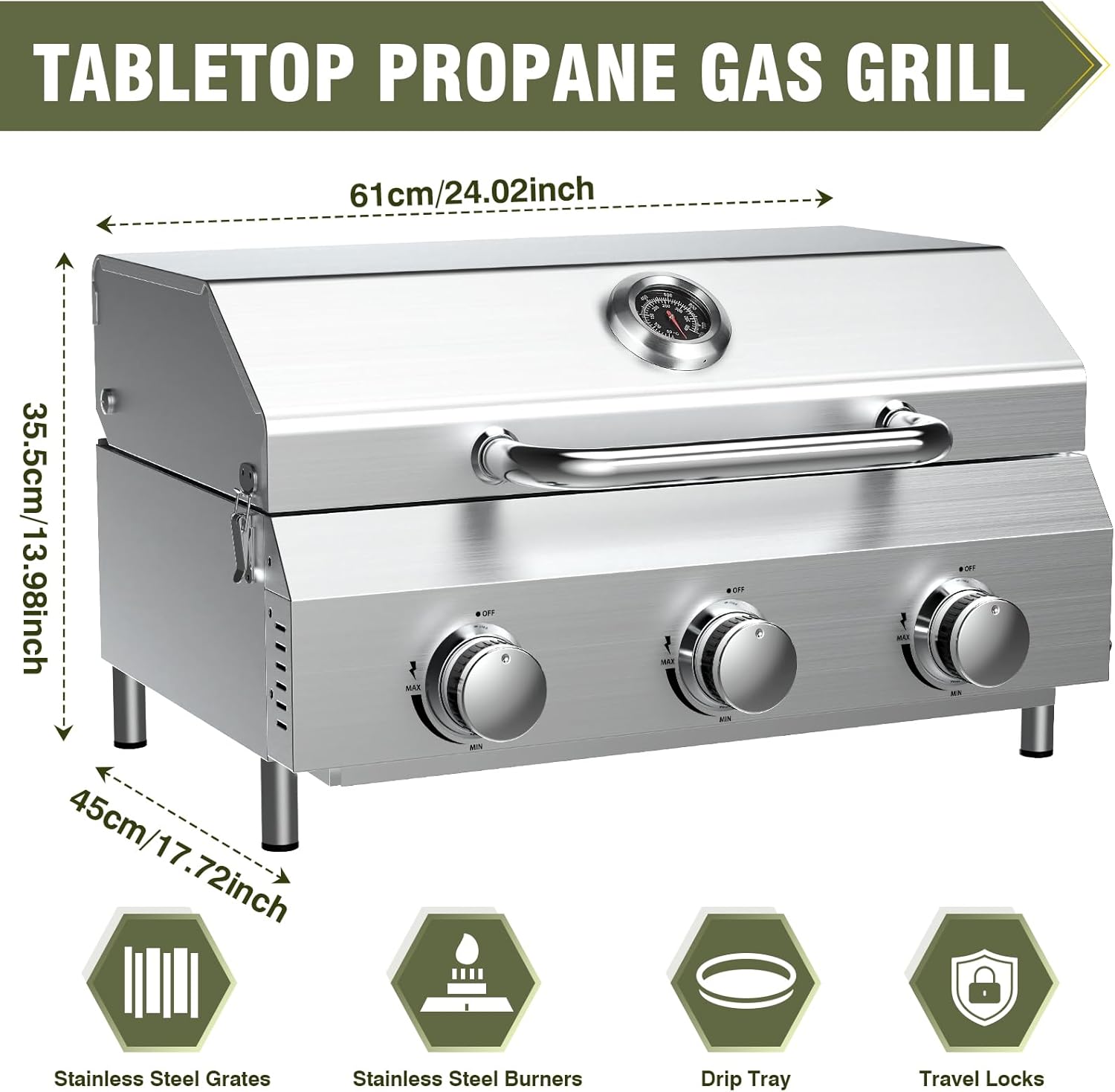 • ☘️【Triple Burner Powerhouse】 Unleash 30,000 BTU grilling force with 3 independent burners. Achieves rapid searing and even heat across the 24-inch thickened stainless steel cooking grate – upgraded for superior heat retention, warp resistance, and heavy food support. Perfect for multi-zone cooking (sear/roast/warm) and feeding crowds. Reduced flare-ups and faster results, whether cooking burgers or brisket.