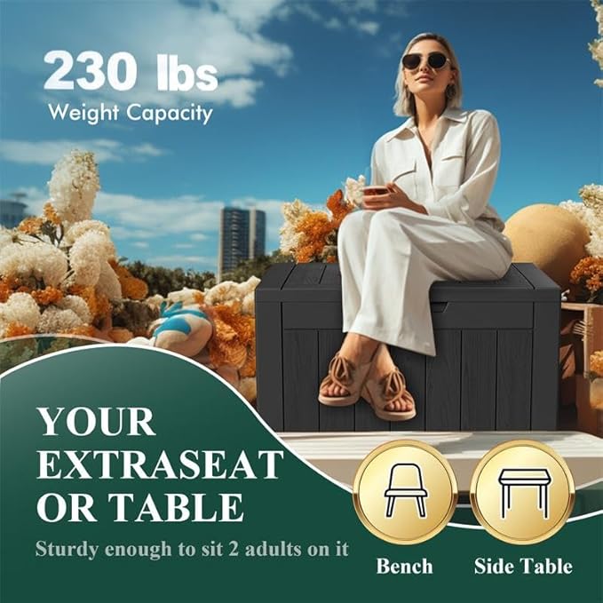 • ADAPTABLE TO VARIOUS SCENES: Whether used as an indoor laundry storage chest or an outdoor deck box container for items like outdoor cushions, garden tools, pool accessories, and sports equipment, this patio storage box provides abundant space. It's also versatile as a side table, yard seat, storage bench, or footrest