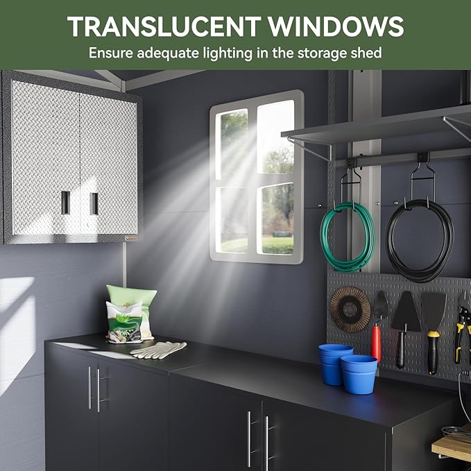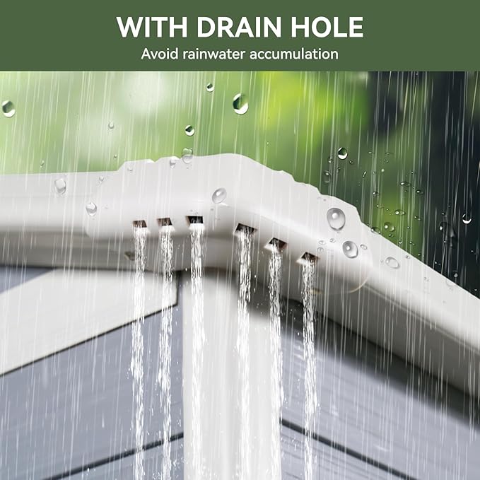 • Secure Storage System :The pitched roof construction effectively channels rainwater and snow to avoid water leakage from the top. Equipped with three-point anti-theft locking device access control, which not only prevents items from being stolen, but also blocks the entry of small wild animals.