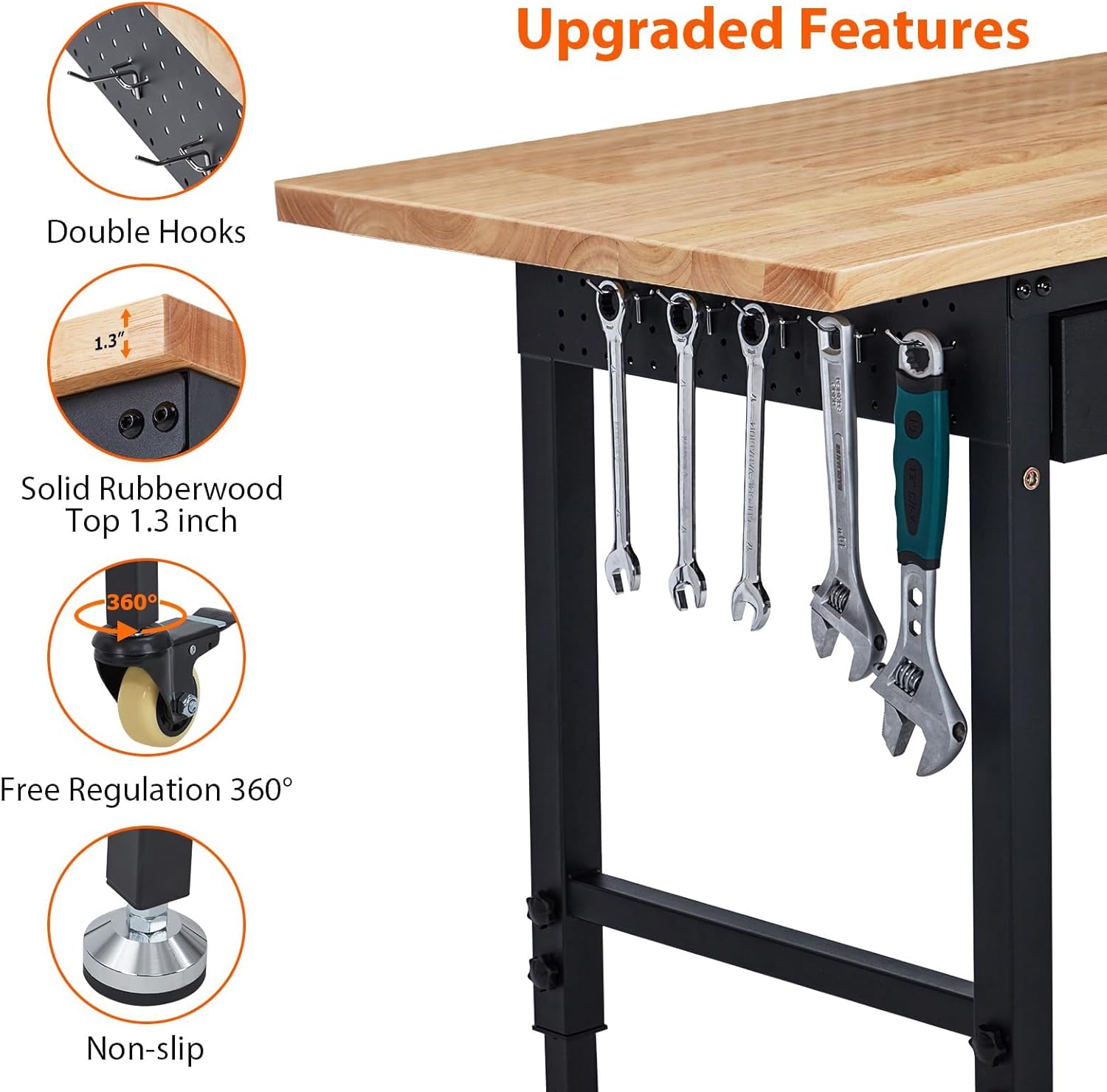 60'' Adjustable Workbench, Heavy Duty Workbench with Drawer, Power Outlet and Lockable Wheels, 2000 LBS Capacity, Work Table Suitable for Office, Garage, Workshop