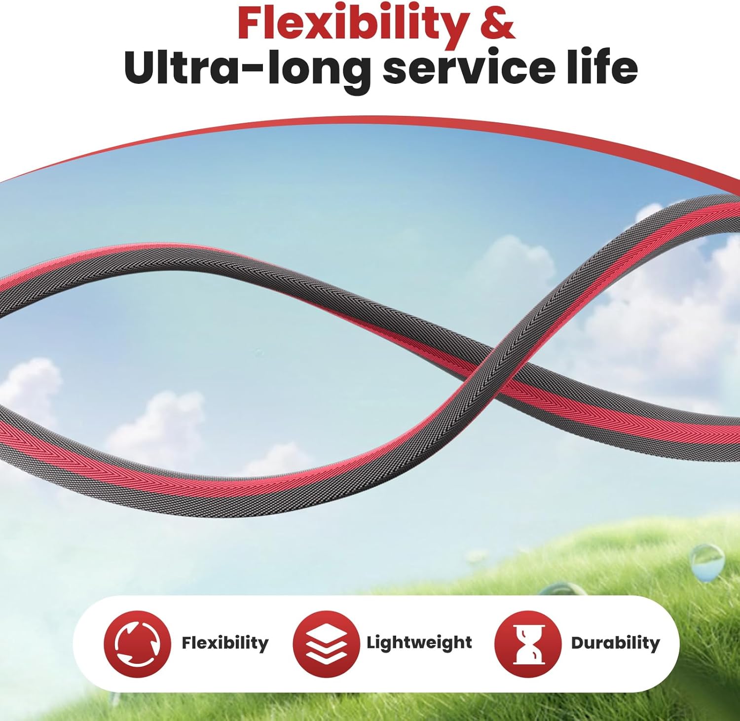 • 🚀 Ultra-Durable 8-Layer Latex Core – Reinforced with high-density polyester mesh and 2X latex layers, this non-expanding garden hose resists leaks, cracks, and bursts under 150-450 PSI, lasting 3X longer than standard hoses.
