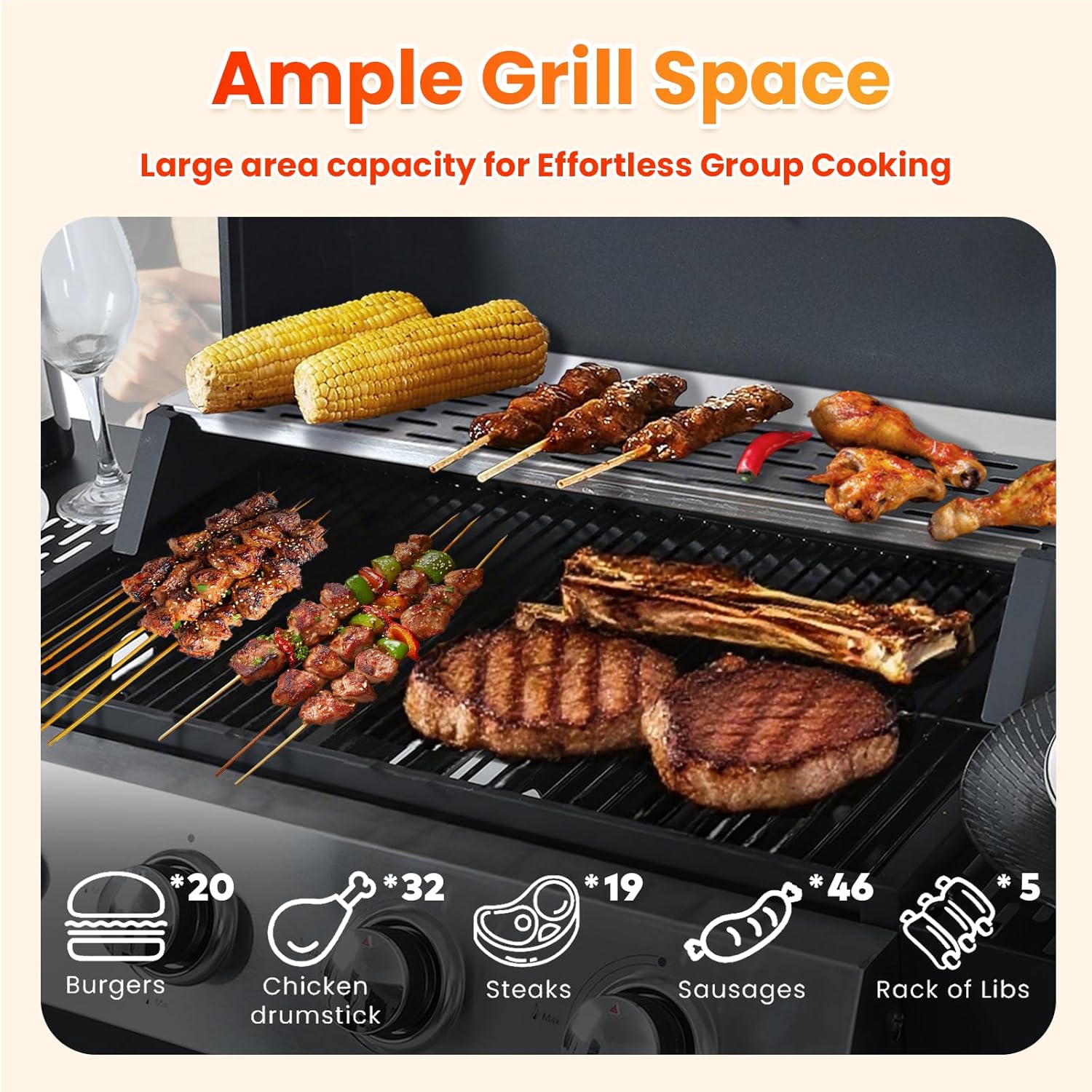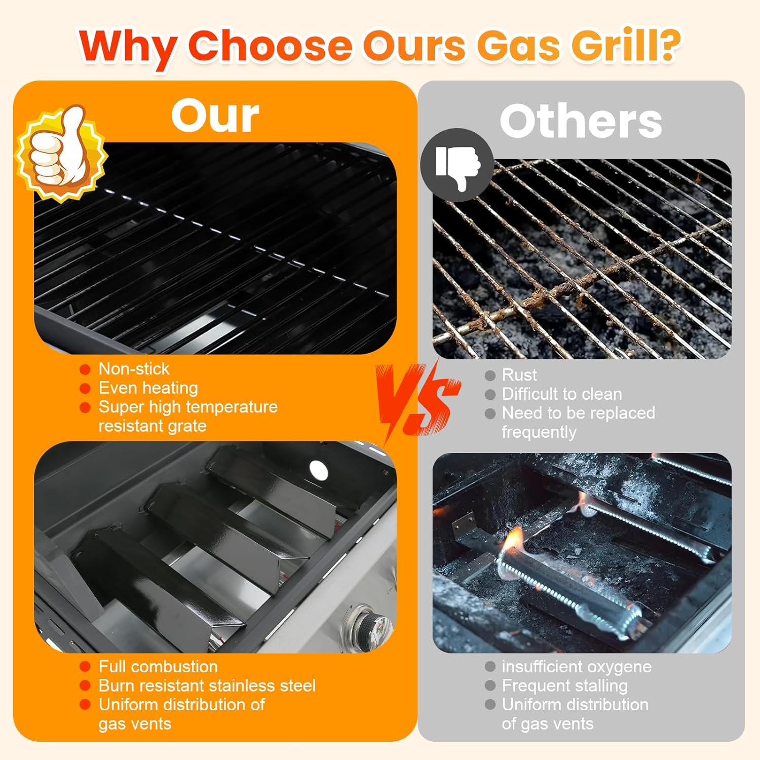 • 🏡 Versatile for Any Outdoor Setting - Perfectly suited for patios, balconies, gardens, or backyards, this propane gas grill brings versatility to your outdoor cooking game. Whether it’s a summer barbecue or a fall cookout, enjoy delicious meals with friends and family all year round in any outdoor space.