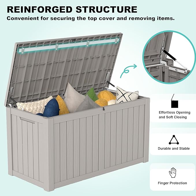 • WATERPROOF AND FADE RESISTANT: Made from premium waterproof and UV-resistant resin, this outdoor storage box is designed to withstand various weather conditions. Its sturdy construction ensures your items stay dry and protected, no matter the season.