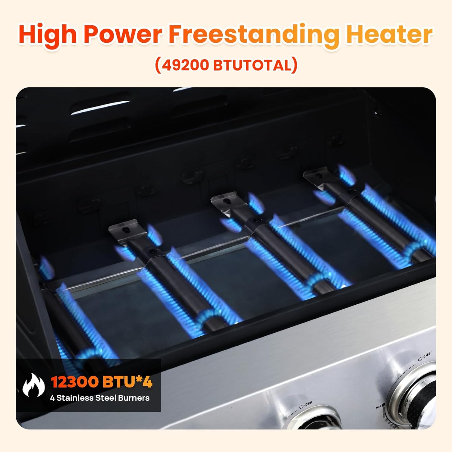• 🔥 High-Performance Stainless Steel Burners - This propane gas grill features 4 powerful stainless steel burners delivering a total of 49,200 BTU per hour. With a built-in piezoelectric ignition system, you can enjoy instant start-up—just push and turn the control knob. It’s reliable, efficient, and ready to fire up your outdoor meals in seconds.